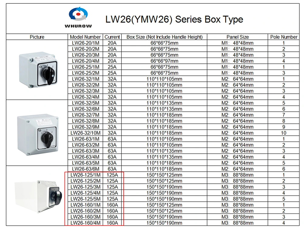 YAMING, ein erfahrener Hersteller mit über 30 Jahren Erfahrung in der Herstellung elektrischer Schalter, präsentiert den wasserdichten Box-Nockenschalter LW26 125A 160A (internes Modell: YMW26-125M 160M), der mit einem wasserdichten Gehäuse ausgestattet ist. Es zeichnet sich durch hervorragende Anpassungsfähigkeit an unterschiedliche Arbeitsbedingungen, vielseitige Funktionen und hohe Sicherheitsleistung aus und ist somit die ideale Wahl für Schaltkreissteuerung, Motorsteuerung, Testgeräte und Hauptsteuerungsszenarien.