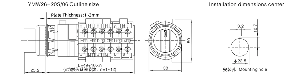 Der 20-A-Einloch-Nockenschalter mit zentraler Montage ist das Ergebnis der jahrelangen technologischen Innovation und Fertigungskompetenz von YAMING. Über einen einfachen Drehknopfschalter hinaus ist er für eine nahtlose und zuverlässige Schaltungssteuerung und -umwandlung konzipiert und dient als Kernkomponente zur Verbesserung der industriellen Steuerungseffizienz und Geräteleistung. Der Schalter verfügt über ein Mittelloch-Installationsdesign mit einer Öffnung von 22,5 mm, was eine schnelle und bequeme Montage in verschiedenen Gerätetafeln ermöglicht.