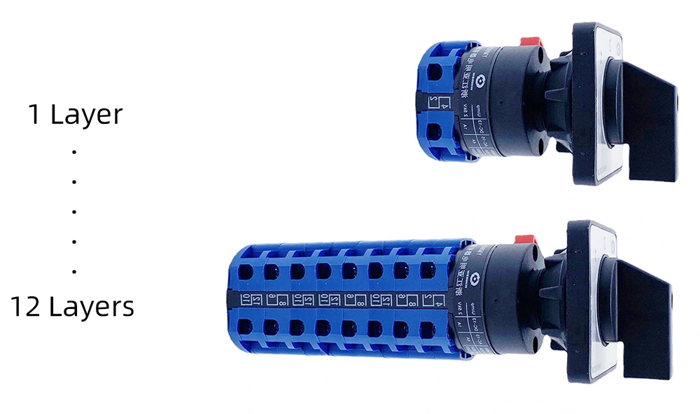 - Systemkomponenten: Flexible Schichtoptionen – 1–12 Schichten für Positionierungsschalter, 1–3 Schichten für selbstrückstellende Schalter und 1–6 Schichten für Motorsteuerungsschalter.